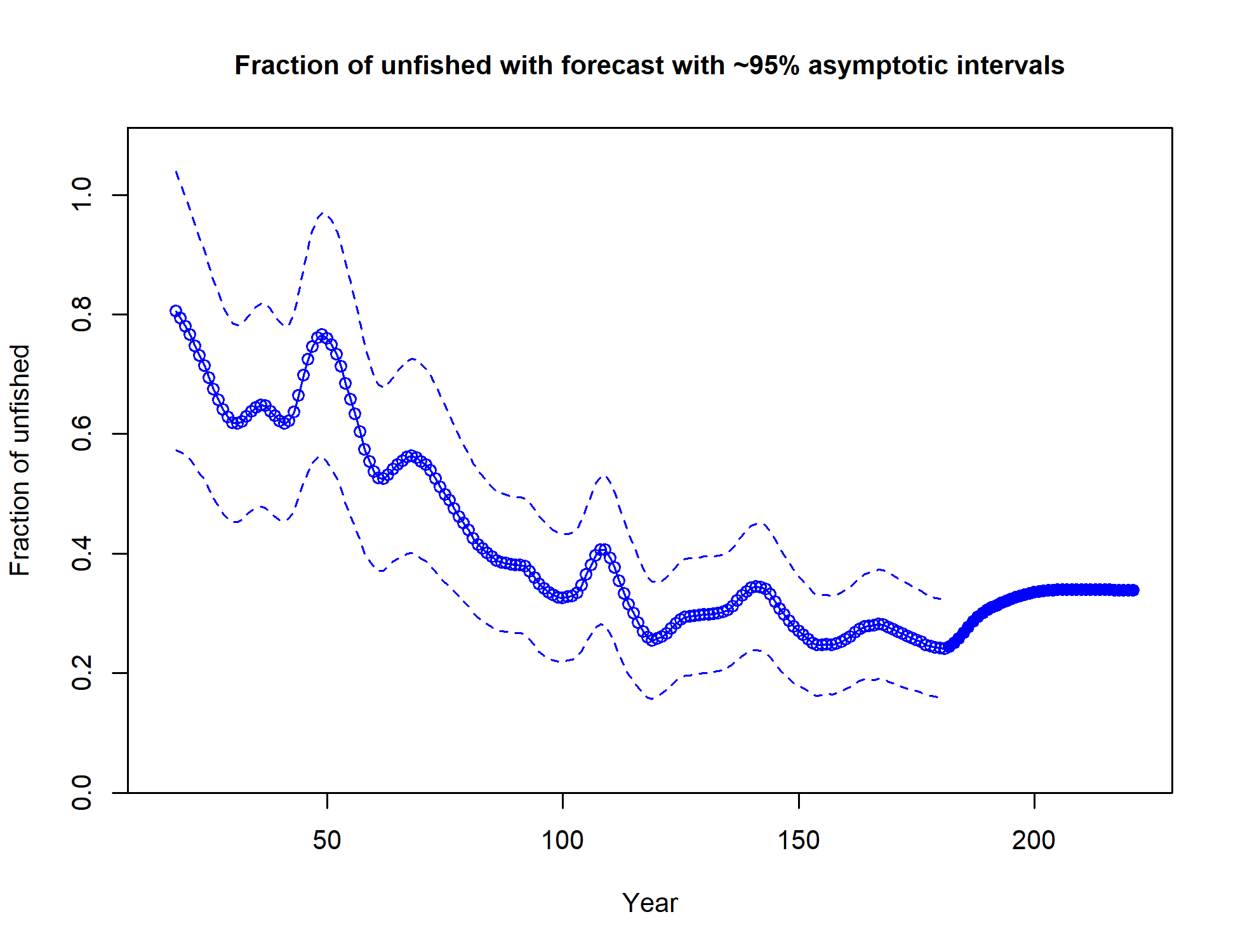 Fraction of unfished with forecast with ~95% asymptotic intervals