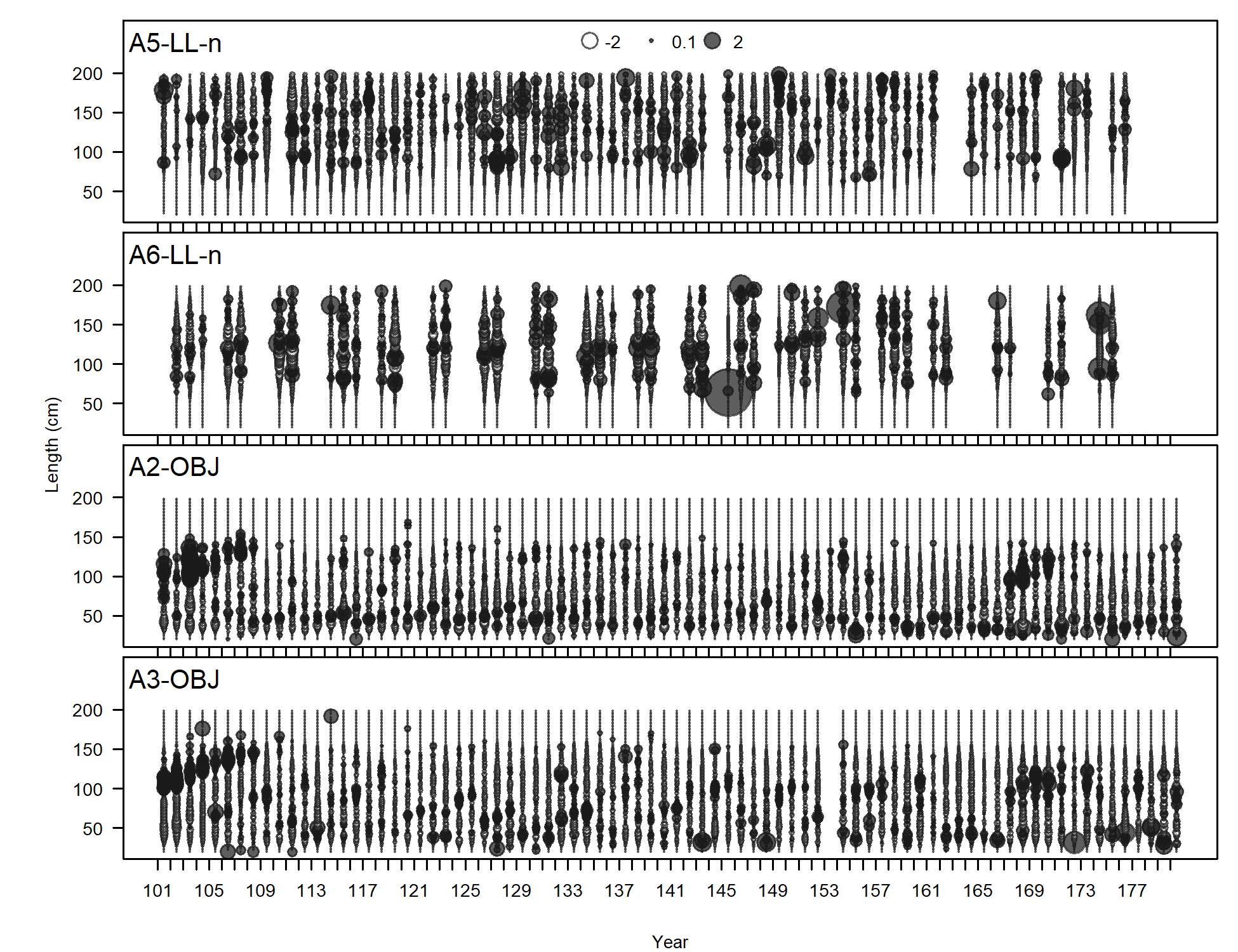 Length comps, whole catch, A6-OBJ (plot 2 of 2)