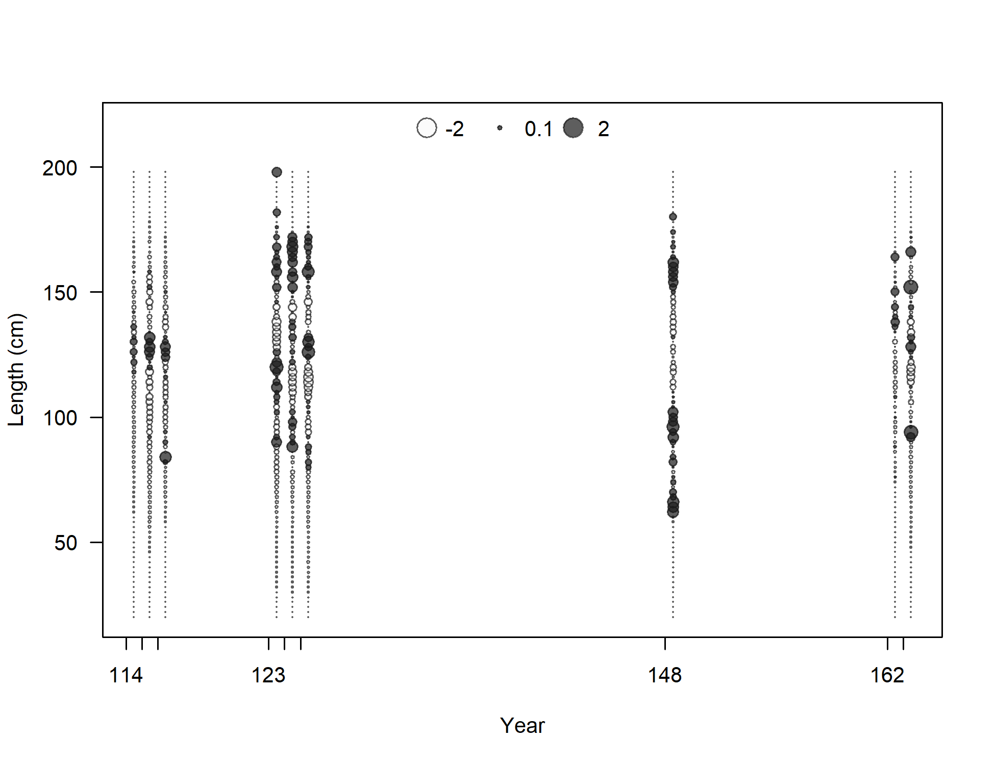 Pearson residuals, whole catch, A2-LL-n (max=5.56) (plot 5 of 5)