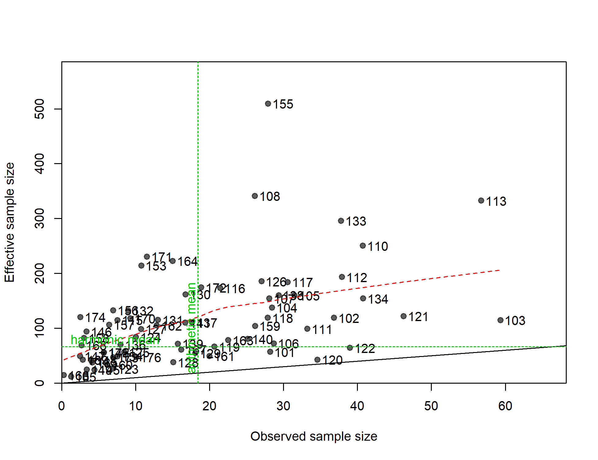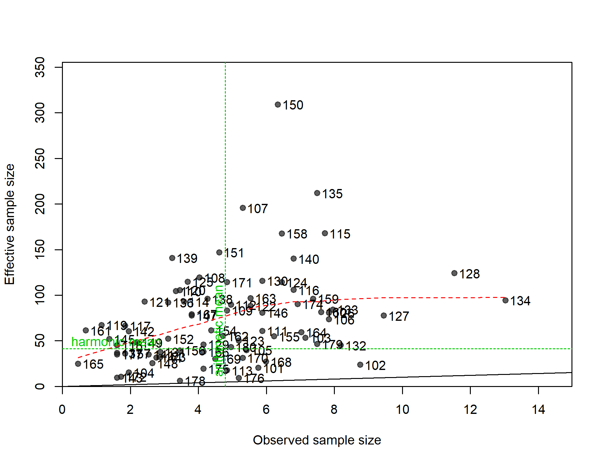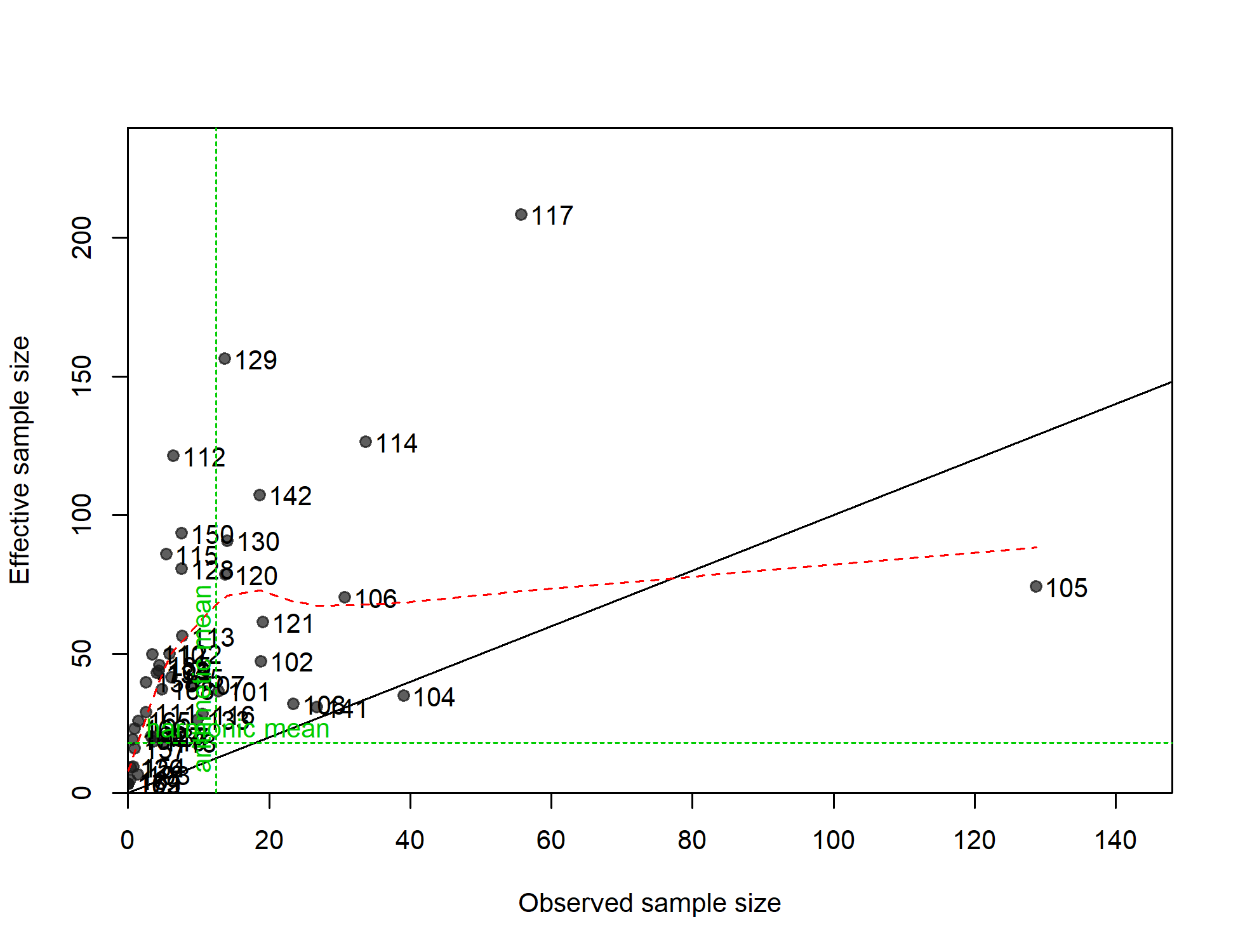 'N adj.' is the input sample size after data-weighting adjustment. N eff. is the calculated effective sample size used in the McAllister-Iannelli tuning method.