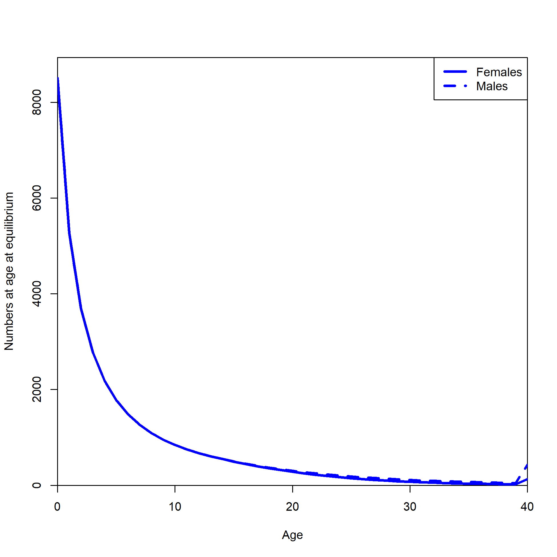 Beginning of year expected numbers at age of females in (max ~ 18.0 million)