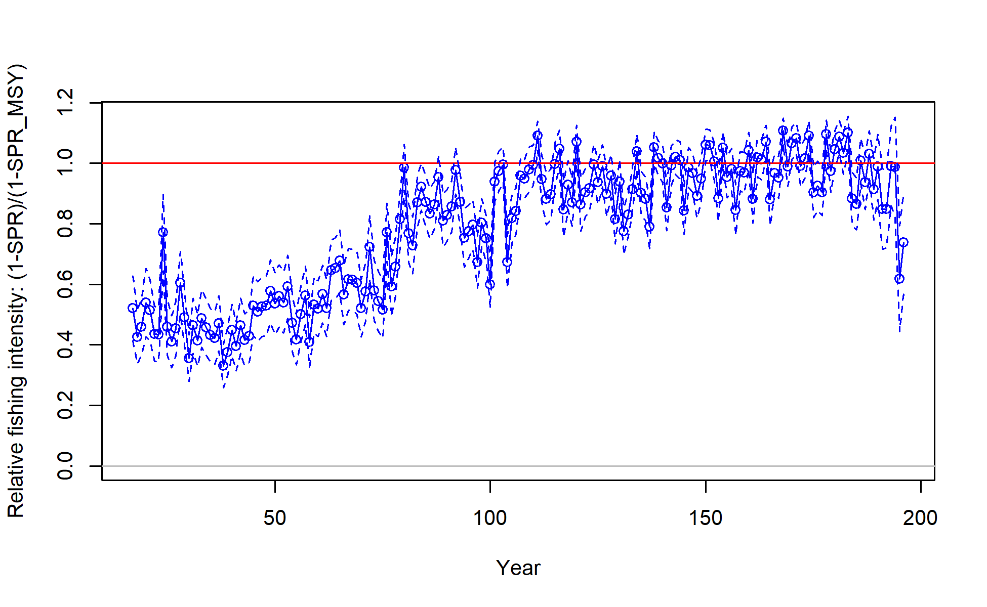 Timeseries of SPR ratio: (1-SPR)/(1-SPR_MSY)