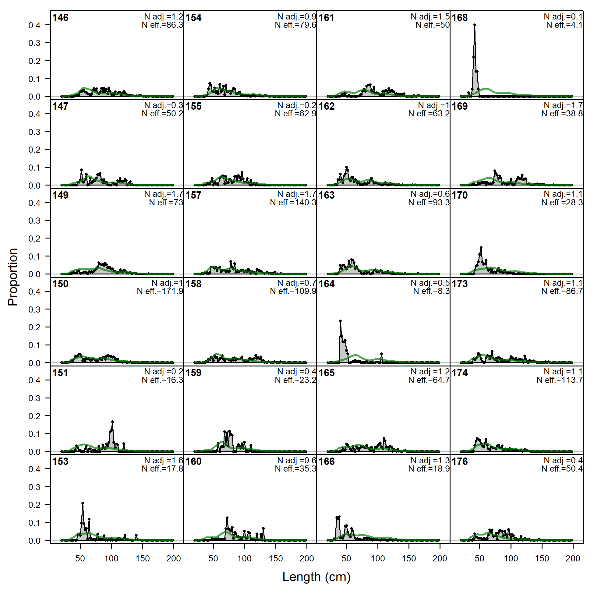 'N adj.' is the input sample size after data-weighting adjustment. N eff. is the calculated effective sample size used in the McAllister-Ianelli tuning method. (plot 2 of 4) (plot 3 of 4) (plot 4 of 4)