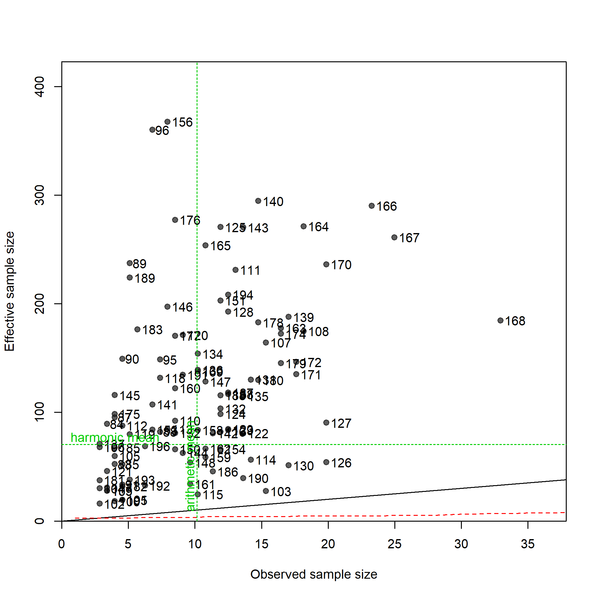 'N adj.' is the input sample size after data-weighting adjustment. N eff. is the calculated effective sample size used in the McAllister-Ianelli tuning method.