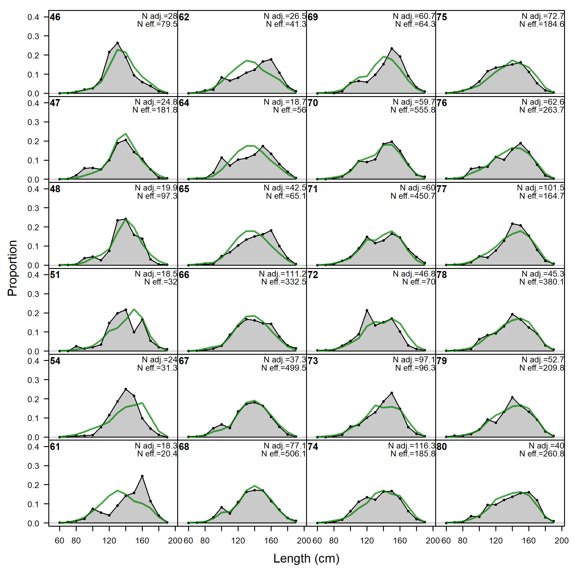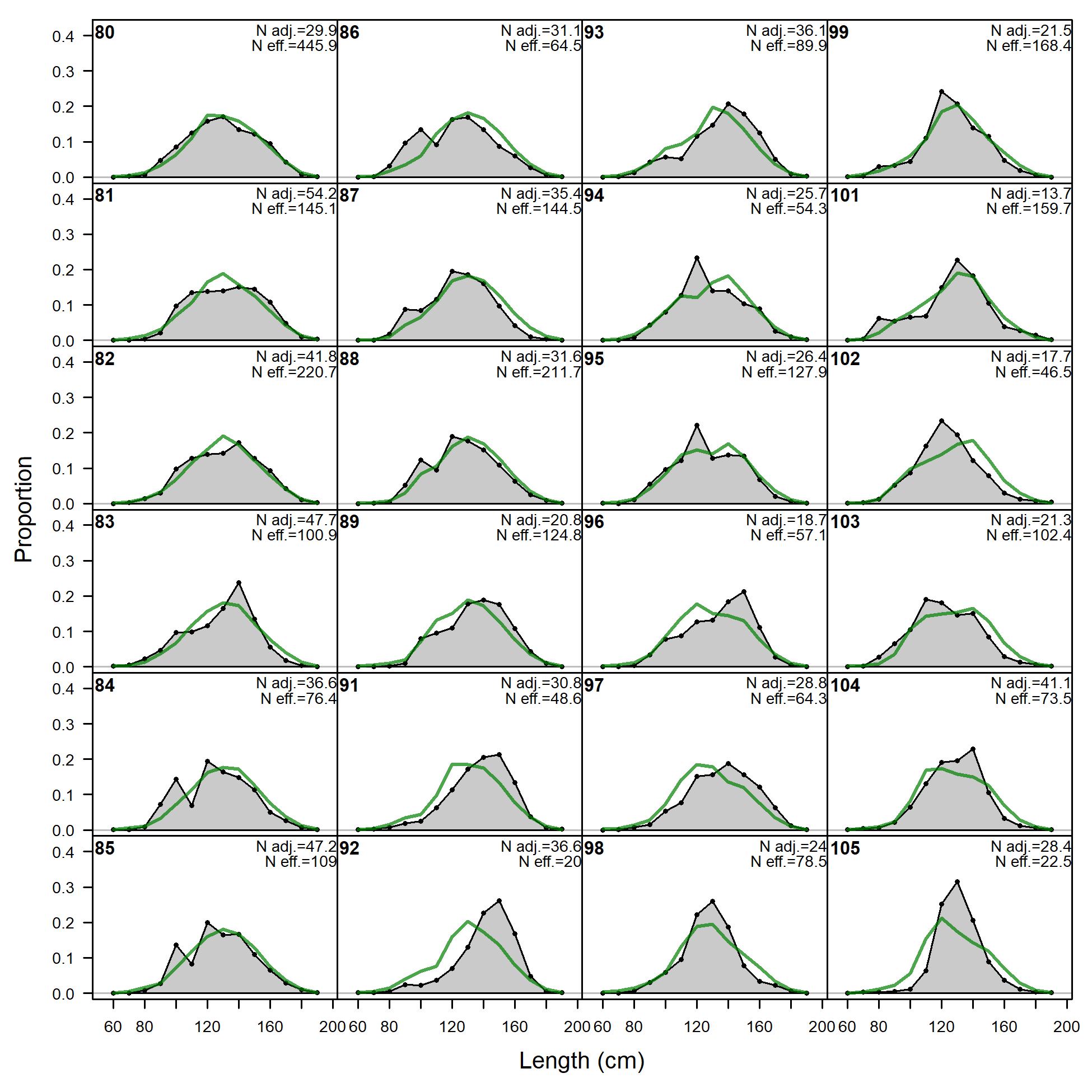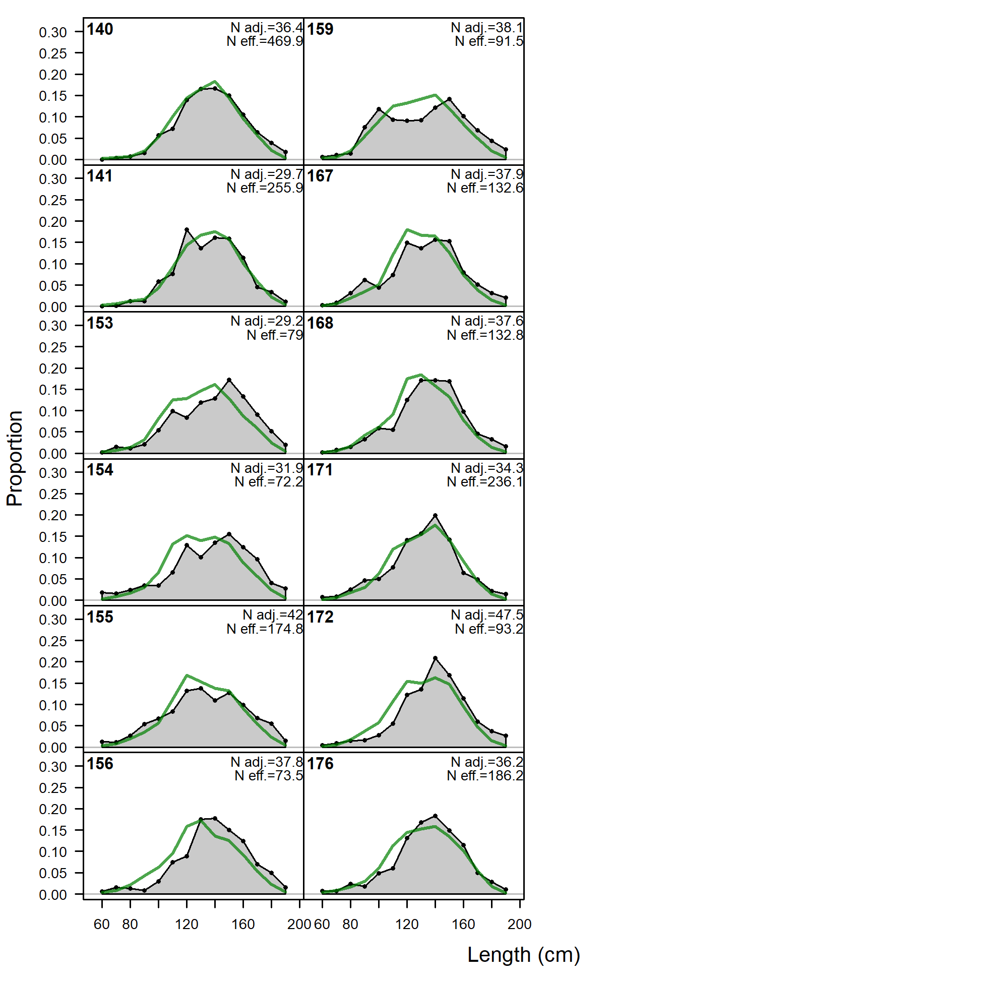 'N adj.' is the input sample size after data-weighting adjustment. N eff. is the calculated effective sample size used in the McAllister-Ianelli tuning method. (plot 2 of 6) (plot 3 of 6) (plot 4 of 6) (plot 5 of 6)