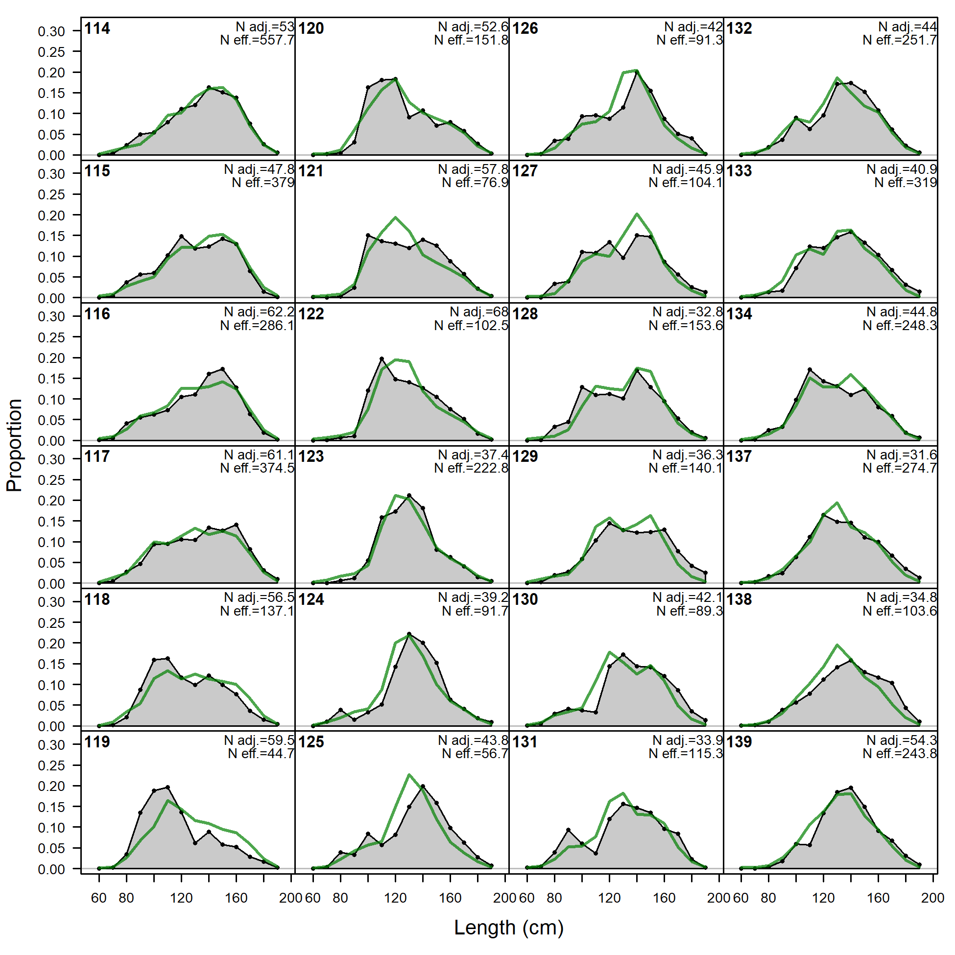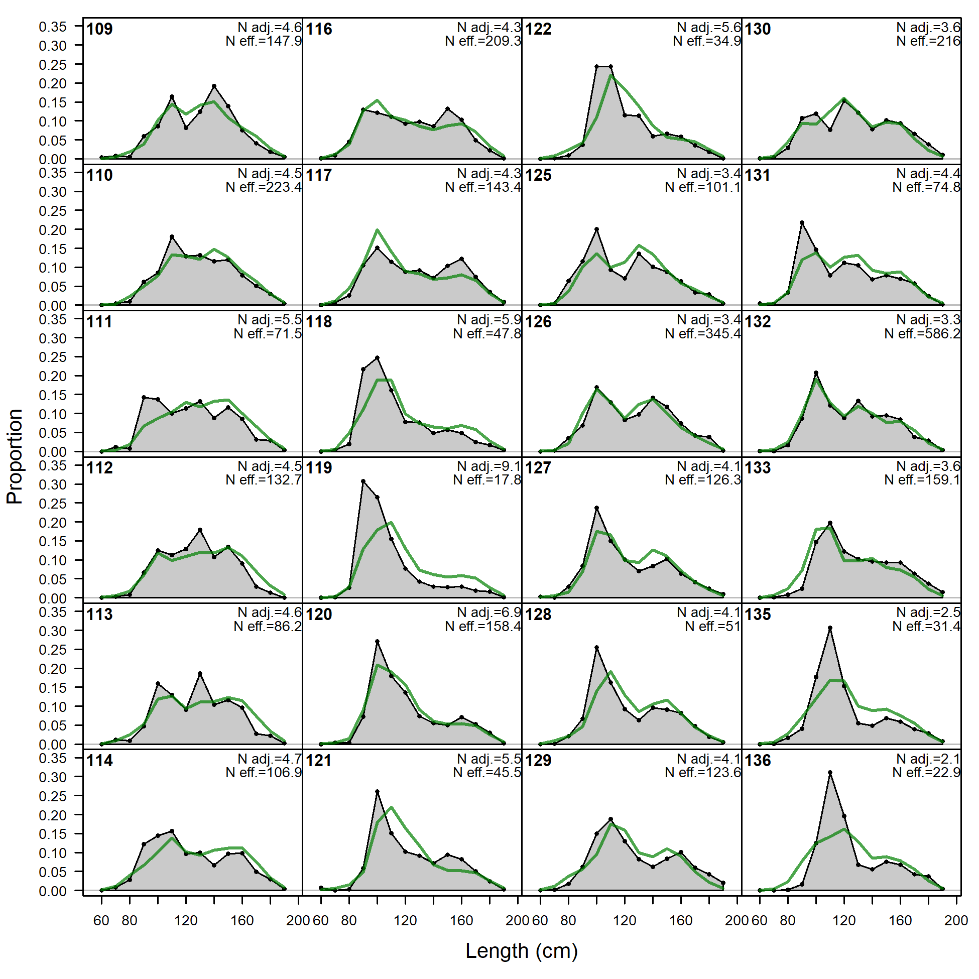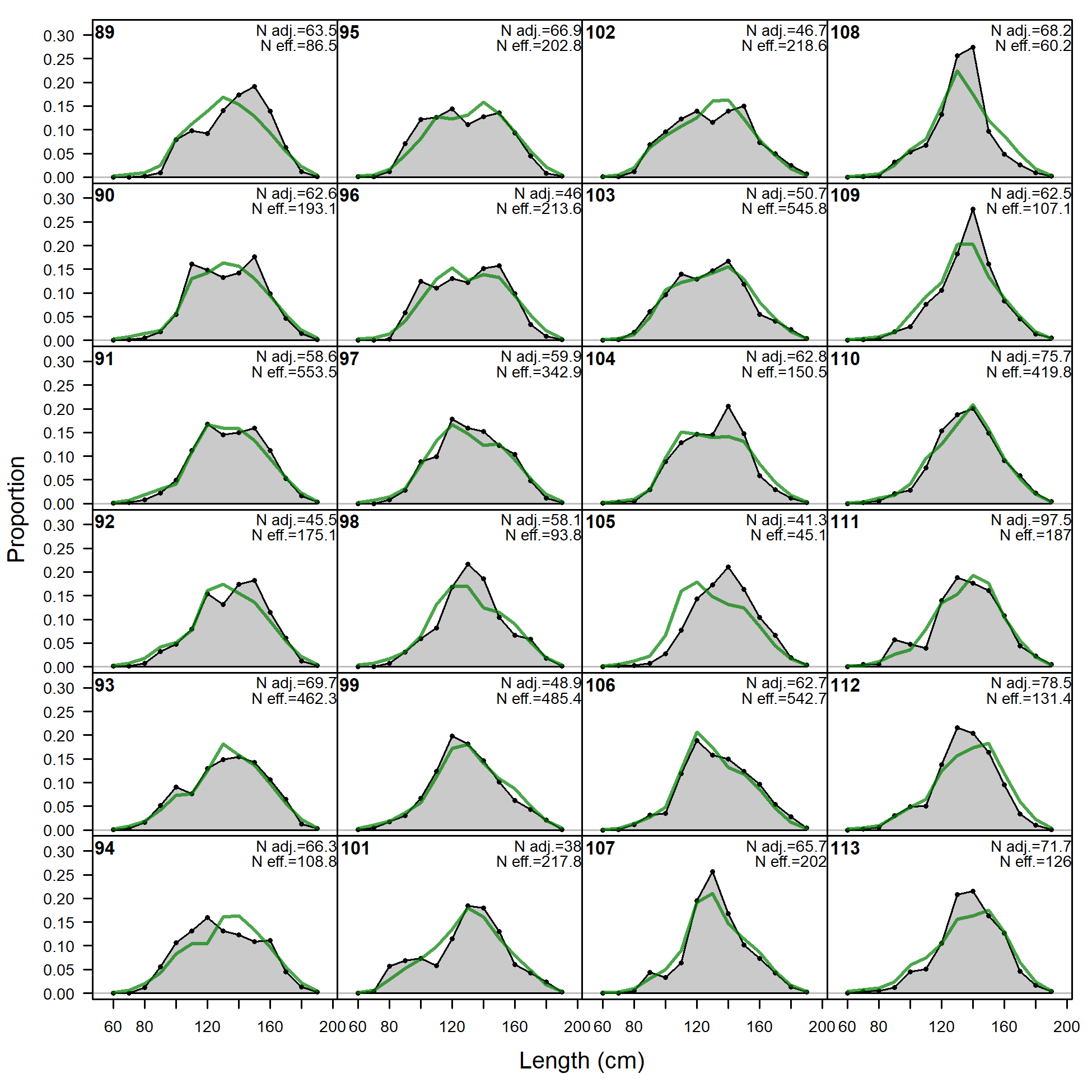 'N adj.' is the input sample size after data-weighting adjustment. N eff. is the calculated effective sample size used in the McAllister-Ianelli tuning method. (plot 2 of 6) (plot 3 of 6) (plot 4 of 6) (plot 5 of 6)