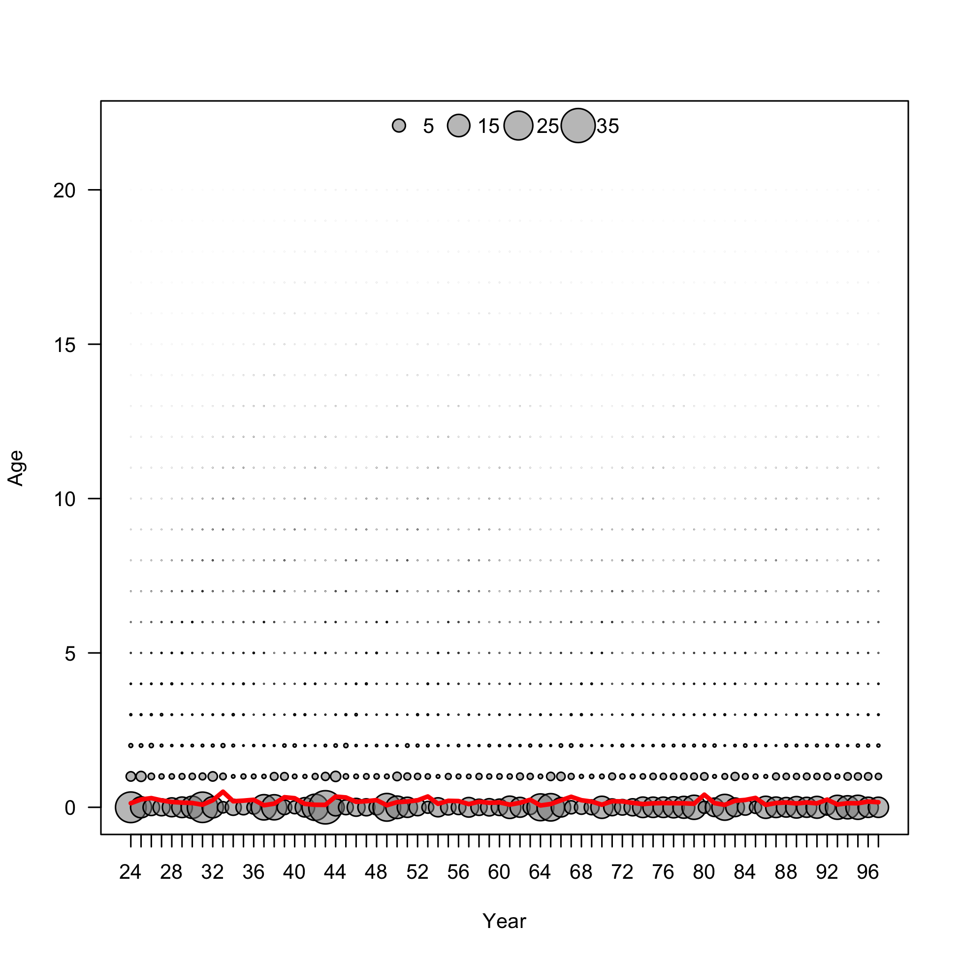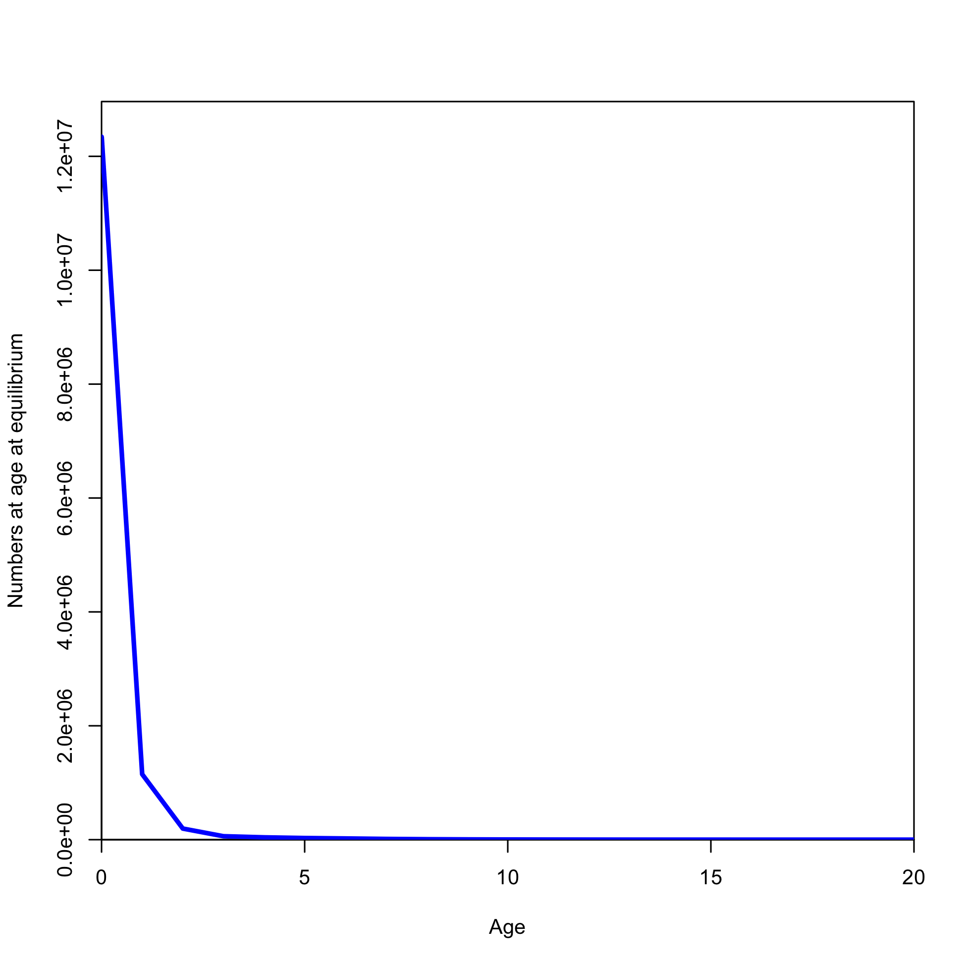 Beginning of year expected numbers at age in (max ~ 33.4 billion)