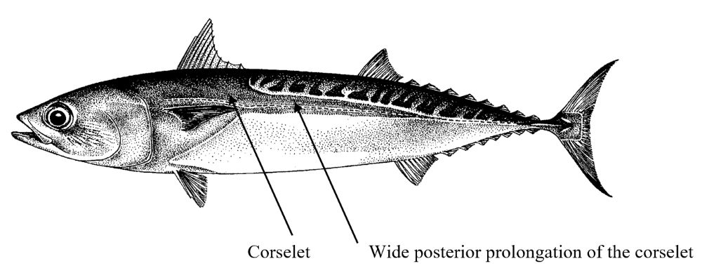 Auxis thazard has a very narrow posterior prolongation of the corselet.