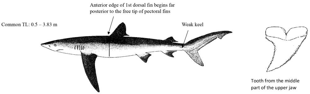 Isurus oxyrinchus has a crescent-shaped caudal fin, long pointed teeth with smooth edges, and a sharp snout.