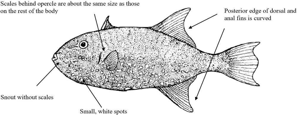 The body of Balistes polylepis is olive brown to pale bluish gray; it is uniform without distinctive markings and the posterior edge of the dorsal and anal fins is almost straight.