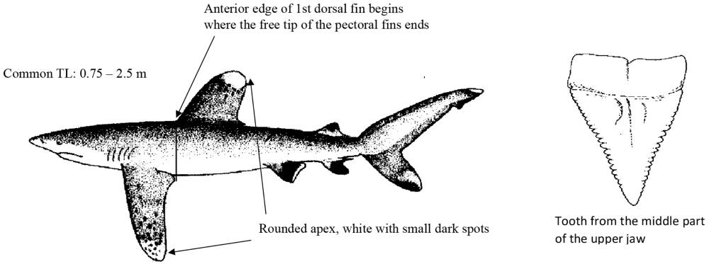 In Carcharhinus leucas the apex of the dorsal and pectoral fins is not rounded and the anterior edge of the first dorsal fin begins anterior to the free tips of the pectoral fins.