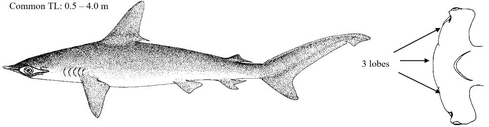 Sphyrna lewini has a median notch on the anterior edge of its head. S. mokarran has a very high, pointed dorsal fin and a small depression on the anterior edge of its head.