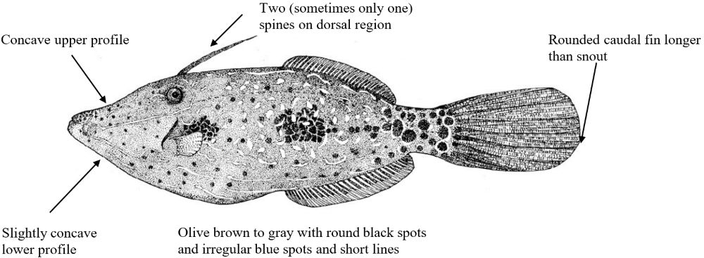 Aluterus monocerus has few spots on the body and the upper profile of its snout is straight or convex.