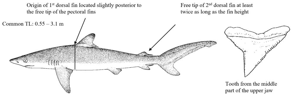 Carcharhinus obscurus has the origin of the first dorsal fin located over the inner edges of the pectoral fins. In C. galapagensis the inner edge of the second dorsal fin is less than twice the fin height. C. limbatus is similar only in the Spanish common name used by crew members, “punta negra”.