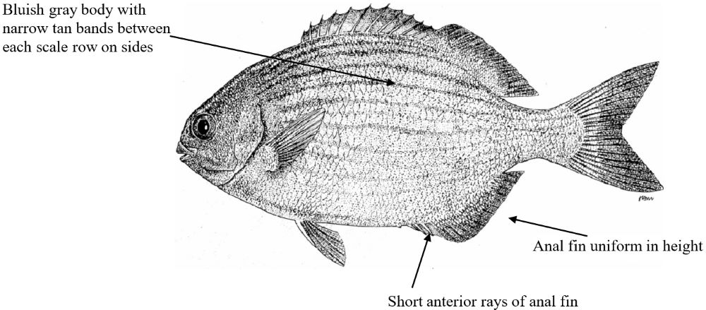 The anterior rays of the anal fin of Kyphosus elegans are longer than the posterior rays. The color of its body is silver gray with faint brownish bands between each scale row on the sides.