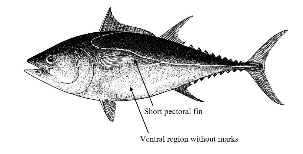 Thunnus obesus has a longer pectoral fin, reaching halfway (in small fish) or more (in large fish) of the base of the second dorsal fin. T. albacares has a longer pectoral fin that reaches the anterior edge of the second dorsal fin.
