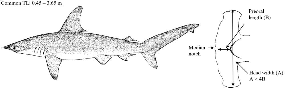 Sphyrna zygaena has three lobes on the anterior edge of its head. S. mokarran has a very high, pointed dorsal fin and a small depression on the anterior edge of its head.