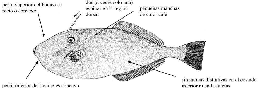 Aluterus scriptus presenta los perfiles superior e inferior del hocico de forma cóncava, además tiene manchas pequeñas y líneas azules en todo el cuerpo.