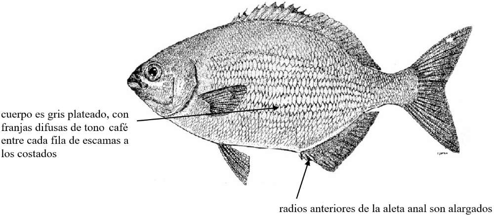 En Kyphosus analogus los radios de la aleta anal son cortos y de similar tamaƱo y el color del cuerpo es gris azulado, con franjas angostas de tono bronceado entre cada fila de escamas a los costados.