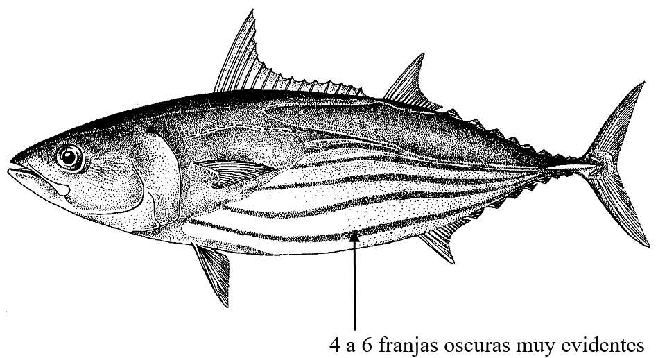 Euthynnus lineatus presenta manchas oscuras, muy definidas por encima de las aletas pélvicas, y no tiene franjas oscuras en la región ventral.