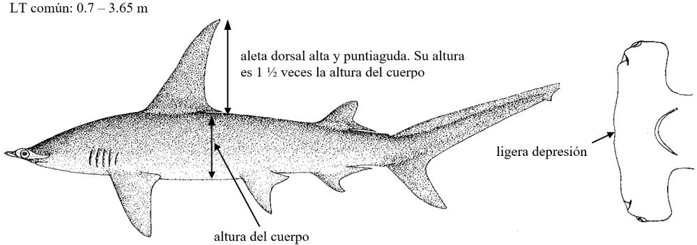 Sphyrna lewini y S. zygaena. La altura de la primera aleta dorsal es menor a 1 ½ veces la altura del cuepo. S. lewini presenta una escotadura media en el borde anterior de la cabeza y S. zygaena presenta 3 lóbulos en el borde anterior de la cabeza.
