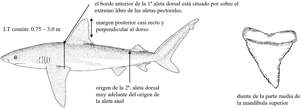 Carcharhinus falciformis presenta el origen de la primera aleta dorsal situado ligeramente por detrás de los extremos libres de las aletas pectorales, y el borde interno de la segunda aleta dorsal es dos veces, o más, la altura de la aleta. C. obscurus presenta la segunda aleta dorsal más pequeña (1.5 a 2.3% de la longitud total).