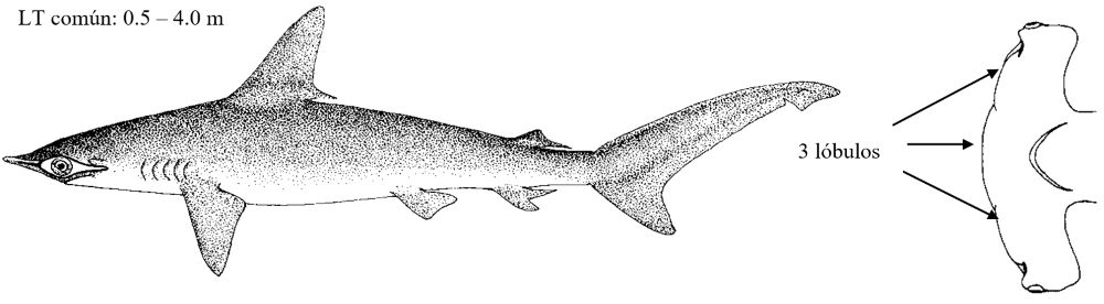 Sphyrna lewini presenta una escotadura media en el borde anterior de la cabeza. S. mokarran tiene la aleta dorsal muy alta y puntiaguda y presenta una ligera depresión en el borde anterior de la cabeza.