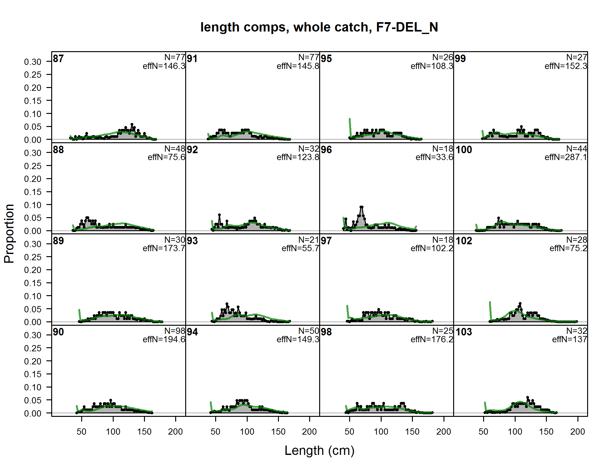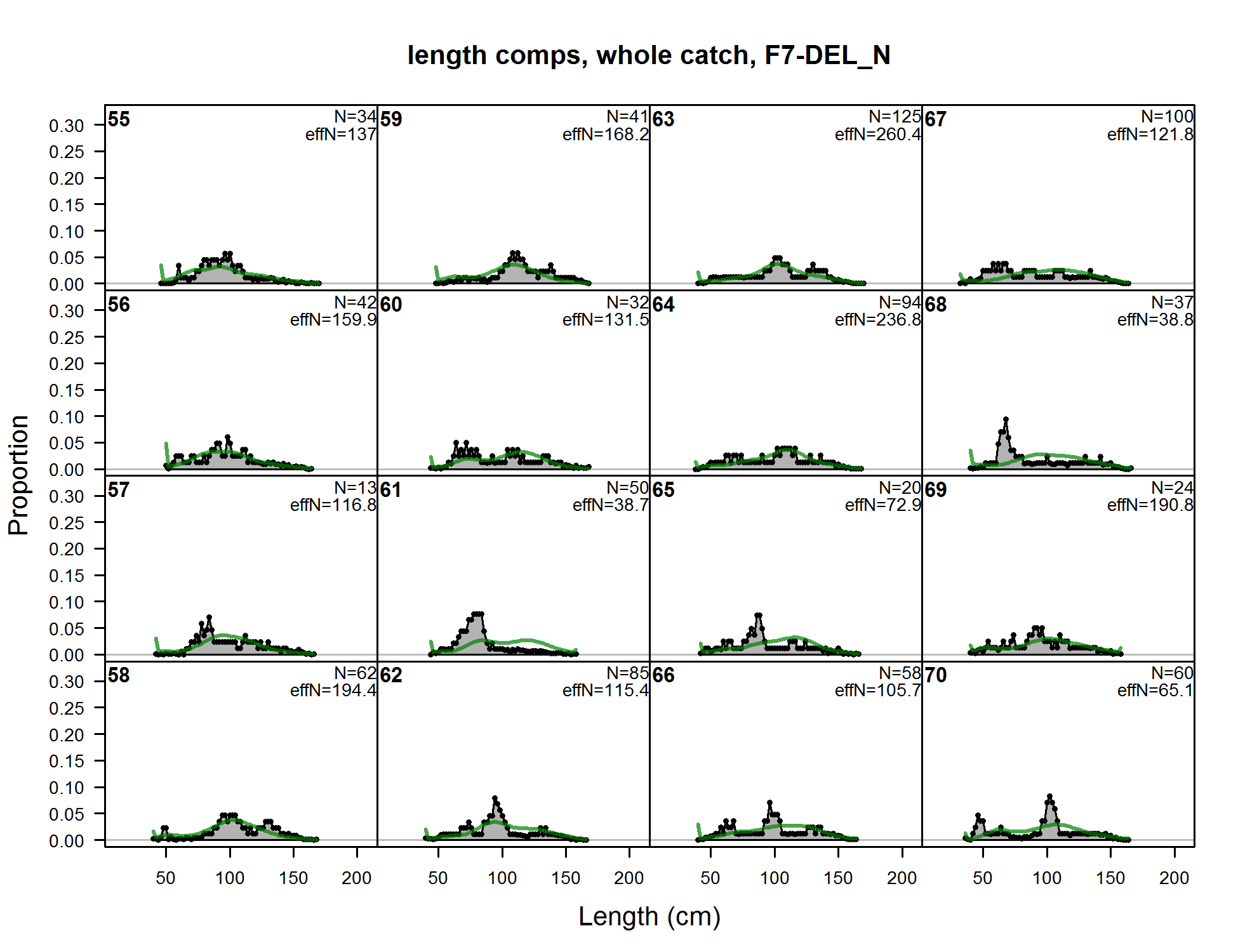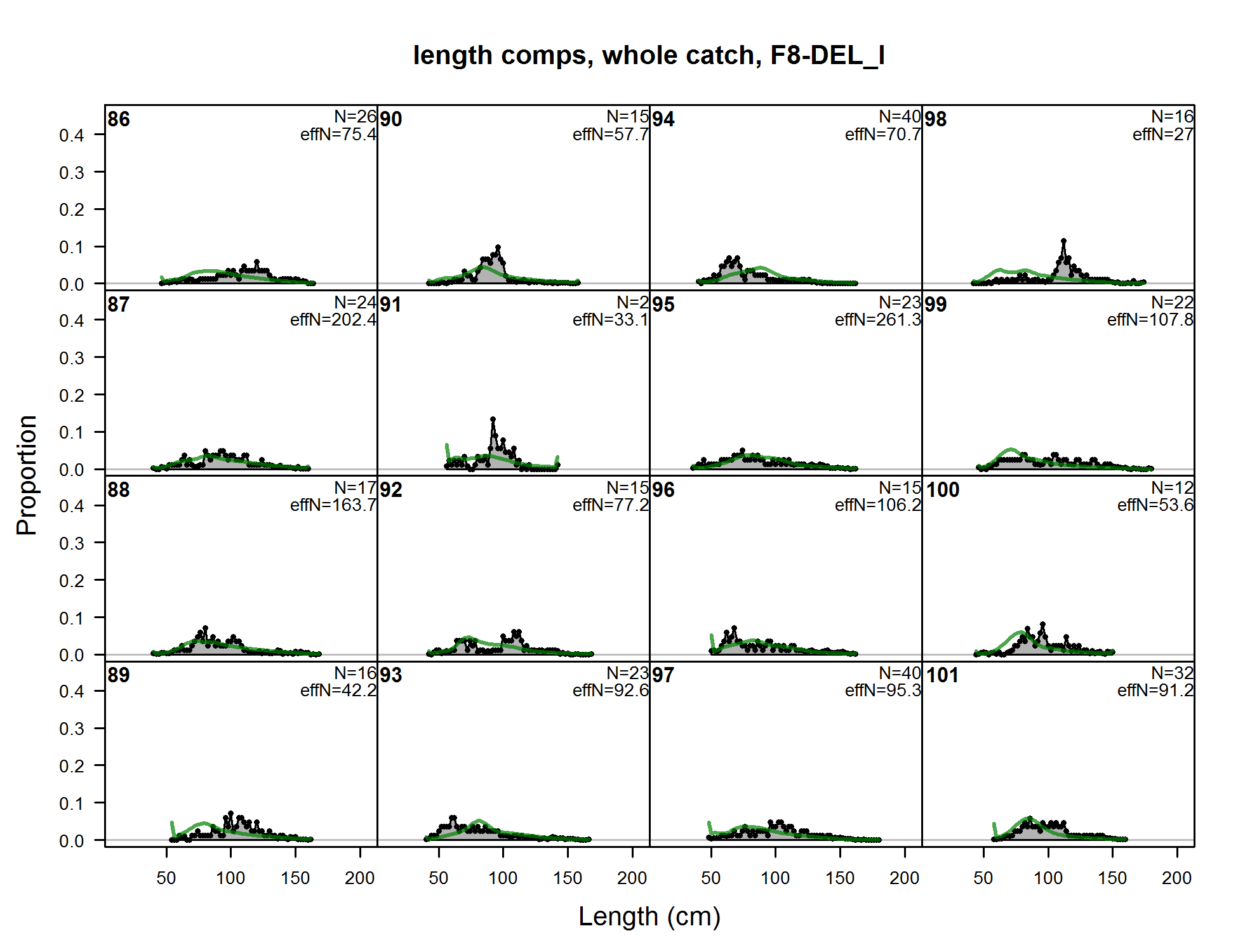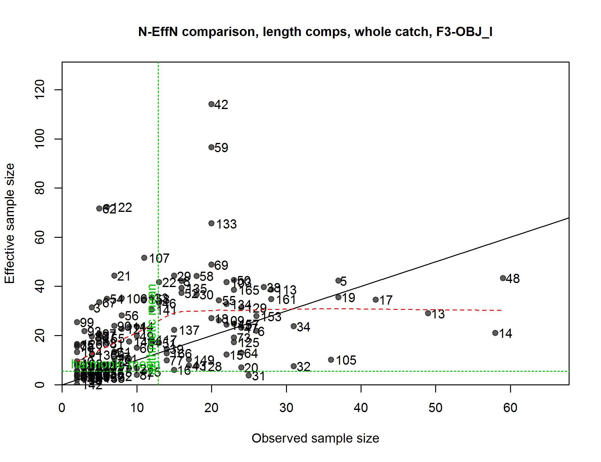 N-EffN comparison, length comps, whole catch, F3-OBJ_I