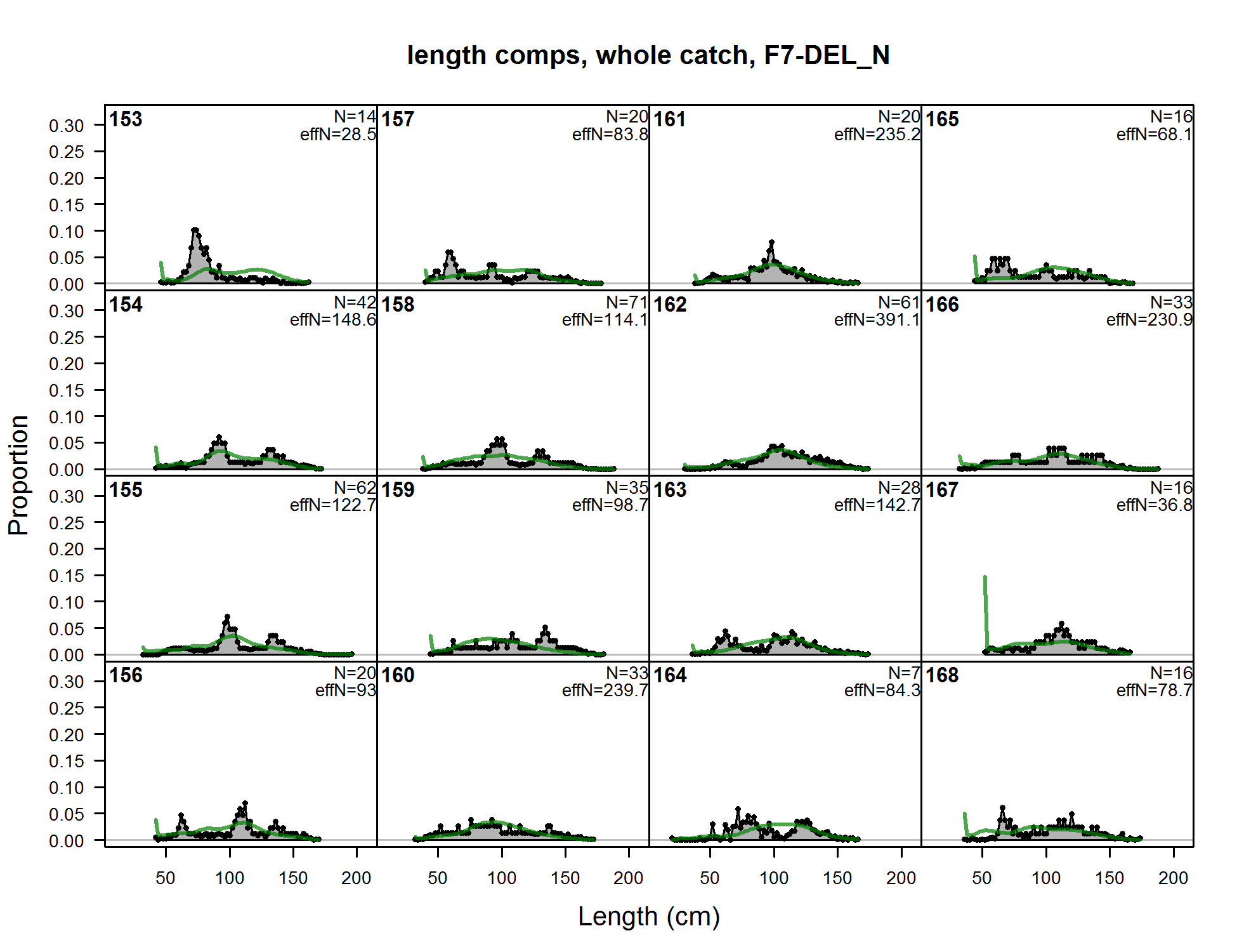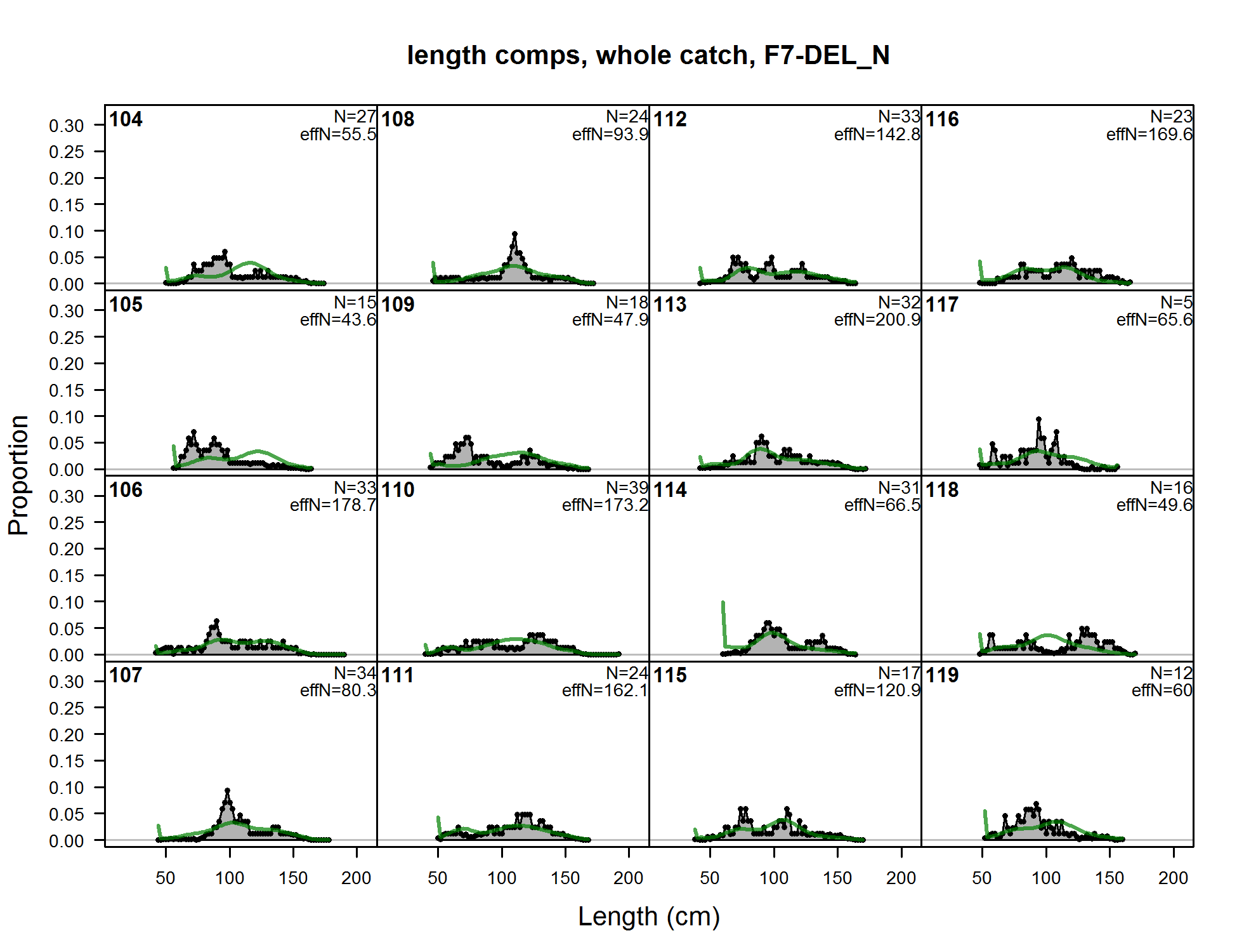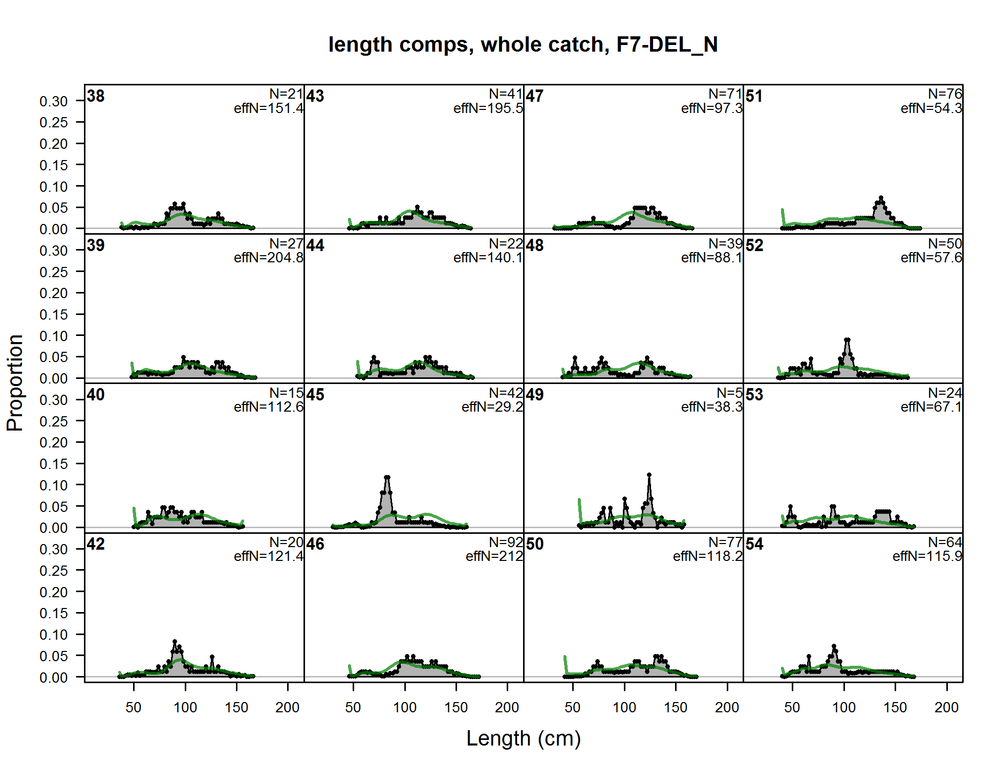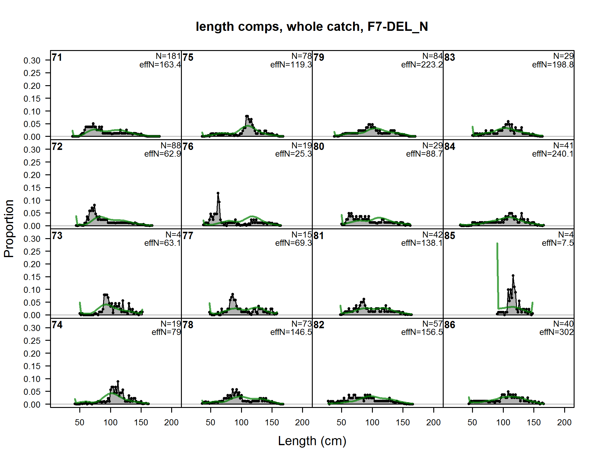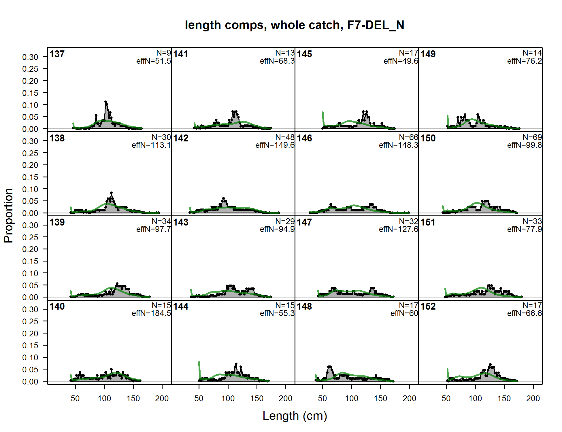 N-EffN comparison, length comps, whole catch, F3-OBJ_I