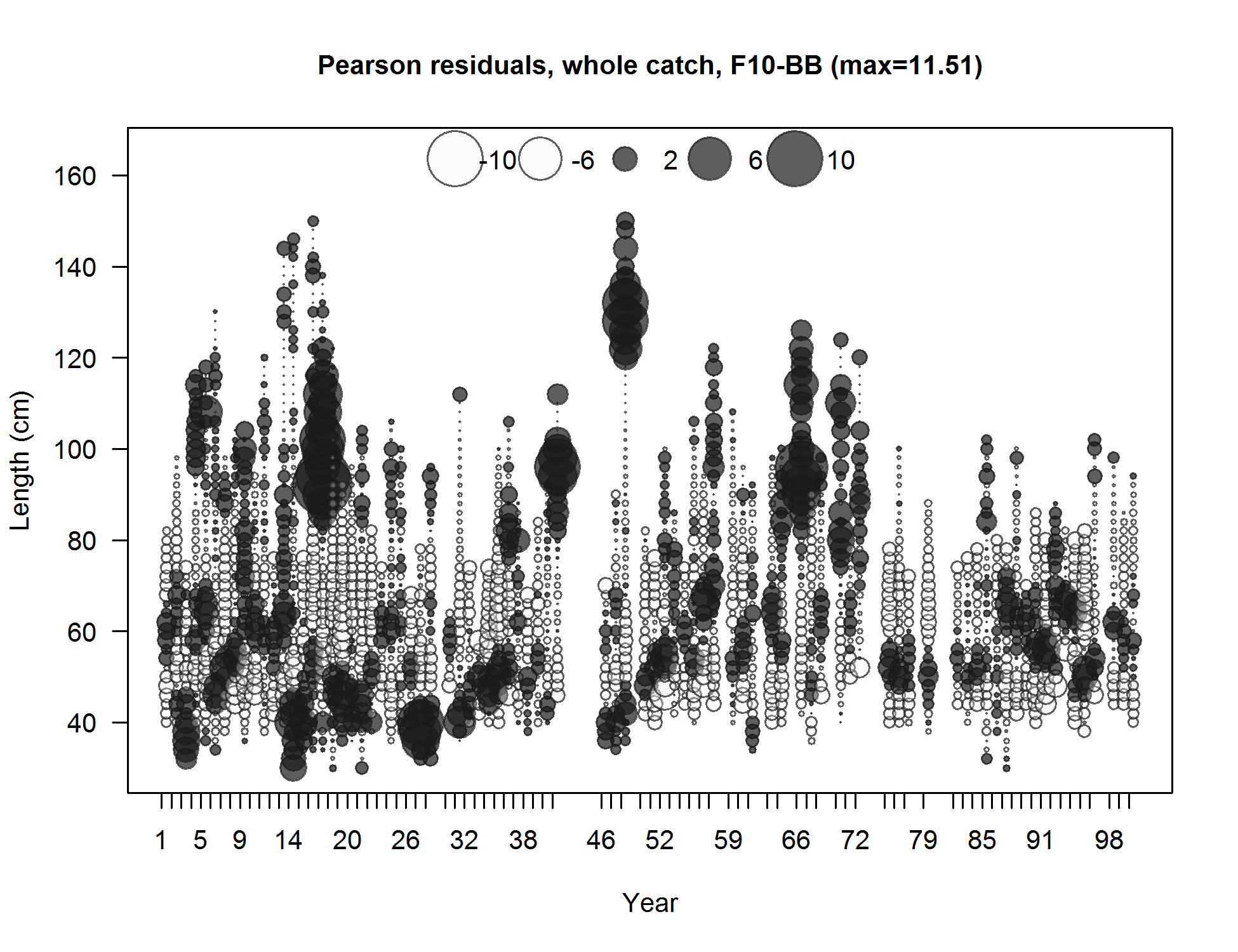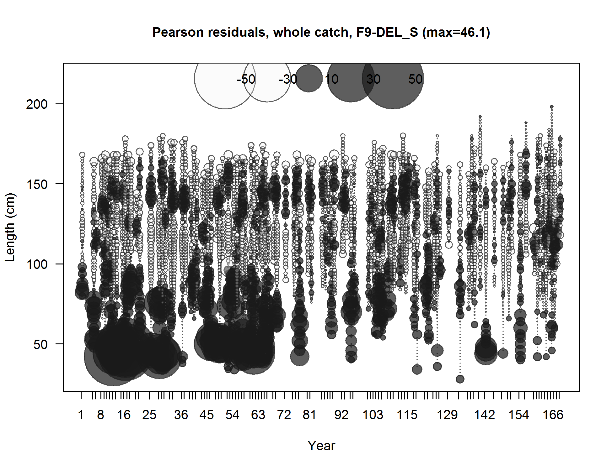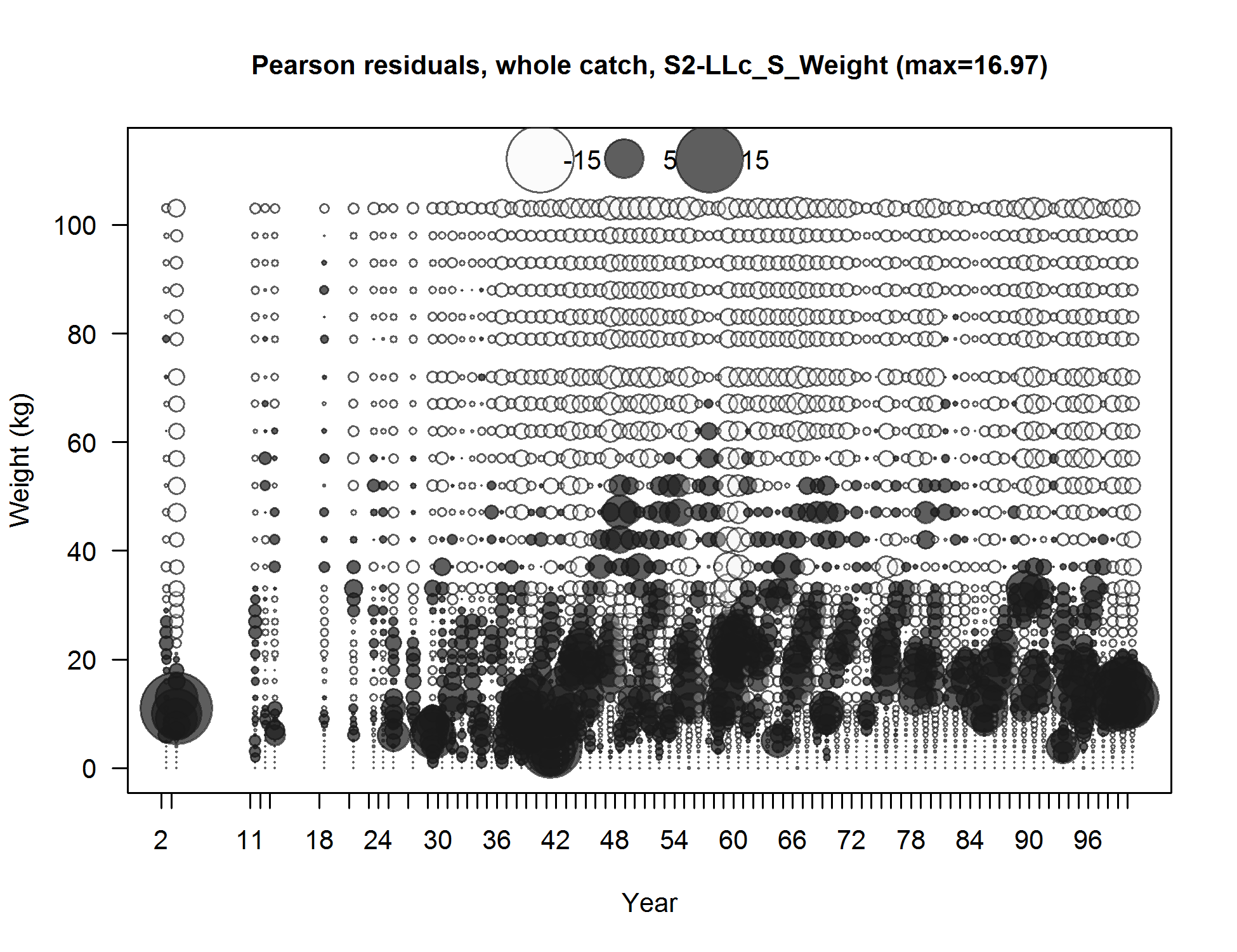 Pearson residuals, whole catch, S2-LLc_S_Weight (max=16.97) (plot 6 of 6)