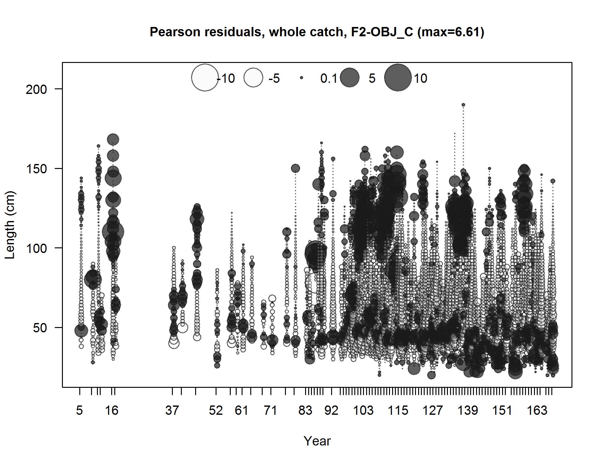 Pearson residuals, whole catch, F2-OBJ_C (max=6.61) (plot 7 of 7)