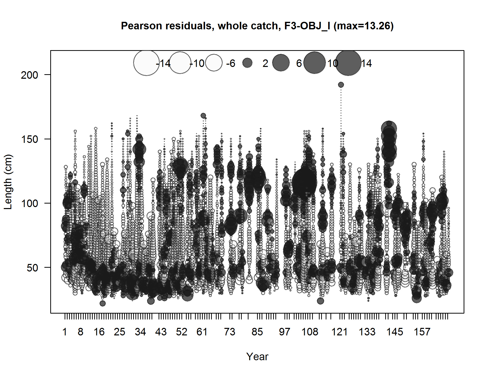Pearson residuals, whole catch, F3-OBJ_I (max=13.26) (plot 9 of 9)