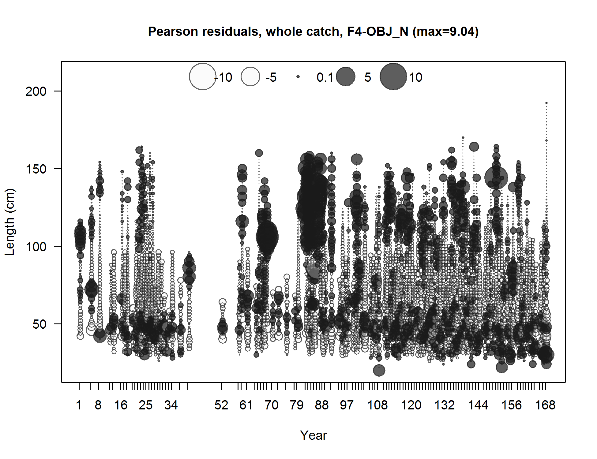 Pearson residuals, whole catch, F4-OBJ_N (max=9.04) (plot 8 of 8)