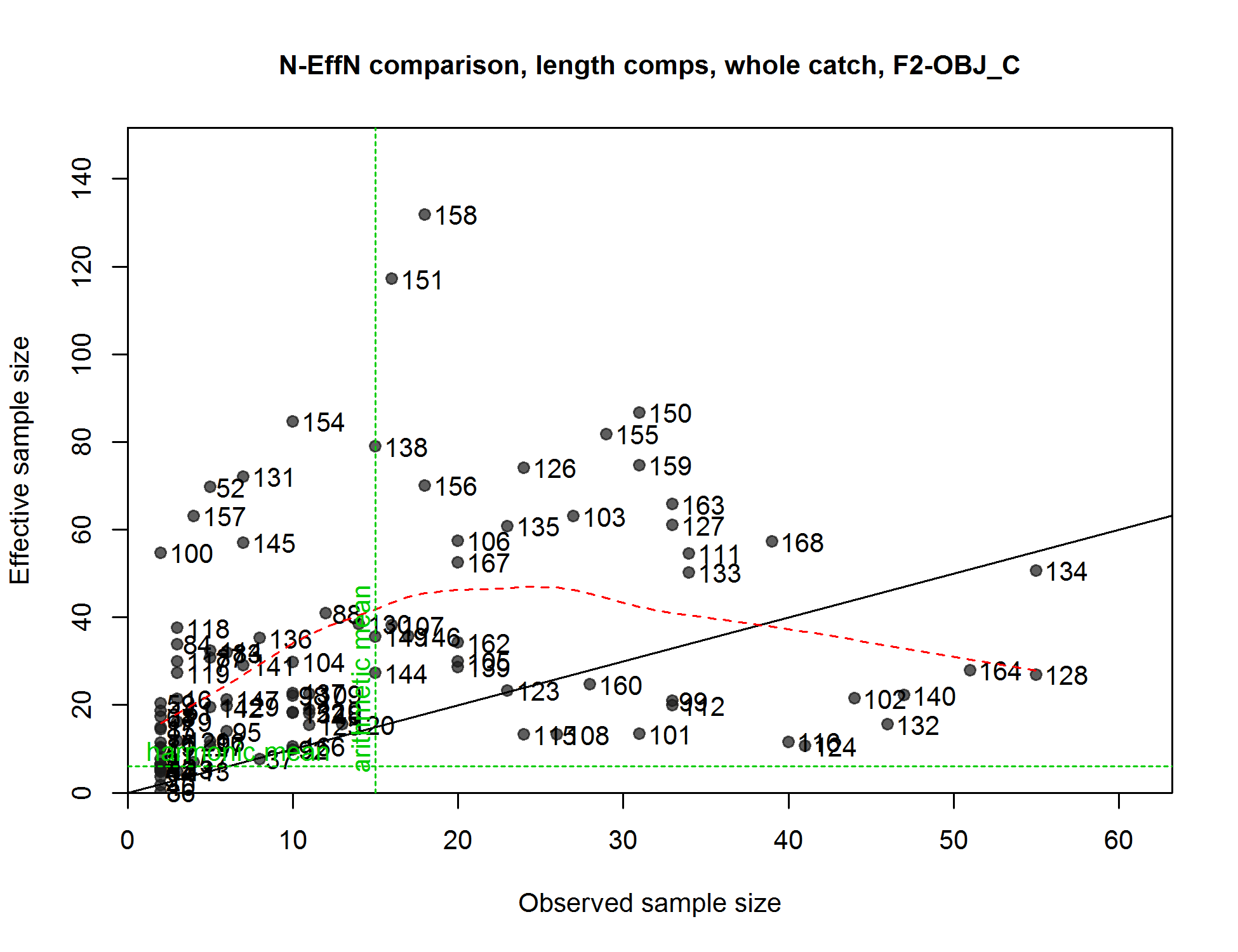 N-EffN comparison, length comps, whole catch, F2-OBJ_C