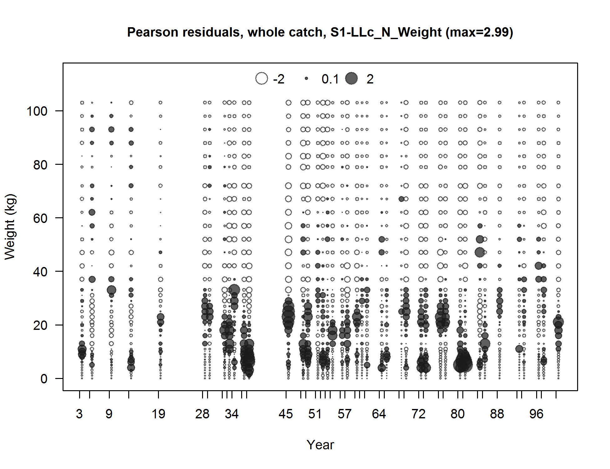 Pearson residuals, whole catch, S1-LLc_N_Weight (max=2.99) (plot 3 of 3)