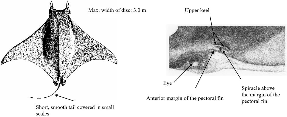 In Mobula thurstoni, the upper keel is an extension of the anterior margin of the pectoral fin. M. japanica has a long tail with a rough surface.