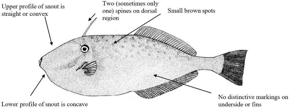 Aluterus scriptus has small spots and blue lines throughout the body and the upper and lower profiles of its snout are concave.
