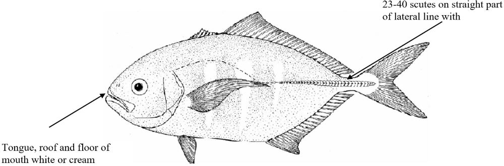 Seriola rivoliana has a dark nuchal band that extends from the eye to the origin of the first dorsal fin. The second dorsal fin of Caranx sexfasciatus is dark with a white tip.