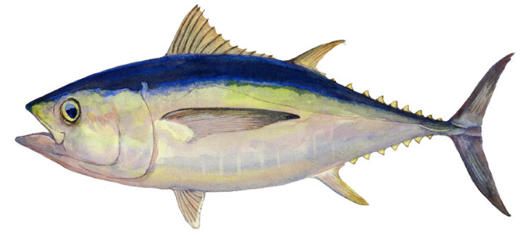 Thunnus albacares tiene la aleta pectoral más corta. La región medio-ventral presenta patrones de líneas y puntos. El cuerpo es más comprimido lateralmente. Los bordes del hígado no presentan estrías. T. orientalis tiene la aleta pectoral más corta y alcanza hasta la mitad de la distancia entre la primera y segunda aleta dorsal.