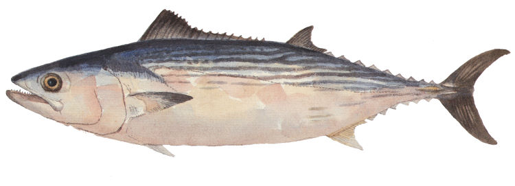 Euthynnus lineatus tiene pocas franjas negras en la región dorsal y tiene manchas negras sobre las aletas pélvicas.