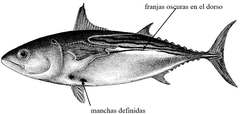 Katsuwonus pelamis no presenta manchas por encima de las aletas pélvicas, y no tiene franjas negras en el dorso. Sarda orientalis presenta la base de la primera aleta dorsal muy ancha y tiene más franjas oscuras en el dorso.