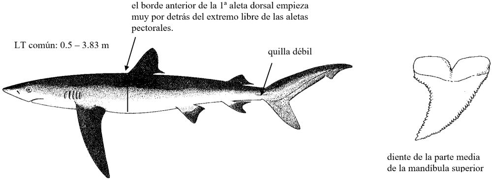 Isurus oxyrinchus presenta la aleta caudal de forma semilunar, con dientes largos, puntiagudos, de bordes lisos, y presenta un rostro aguzado.