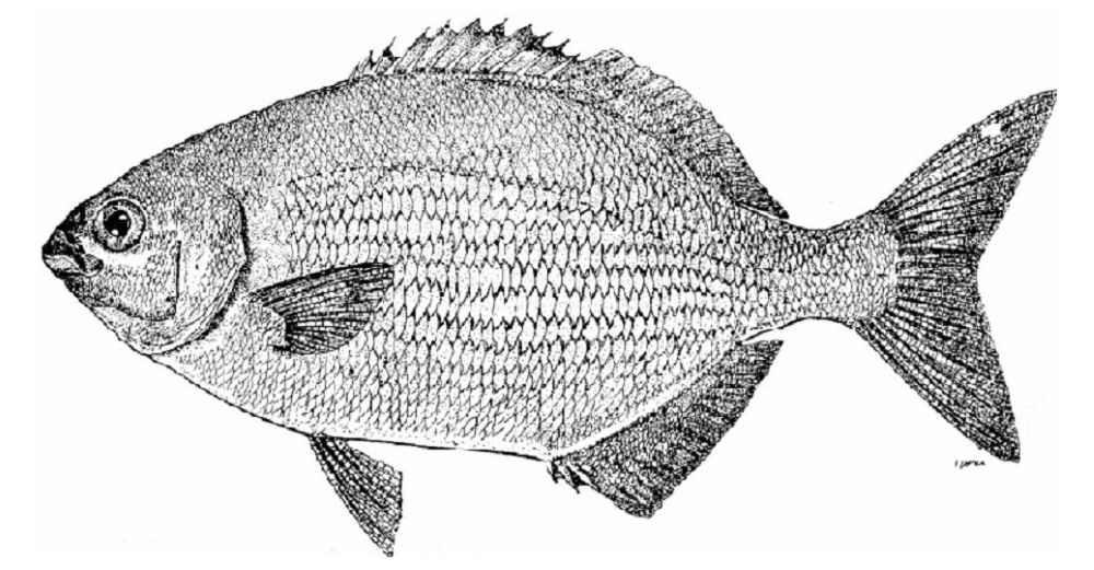 En Kyphosus analogus los radios de la aleta anal son cortos y de similar tamaƱo y el color del cuerpo es gris azulado, con franjas angostas de tono bronceado entre cada fila de escamas a los costados.