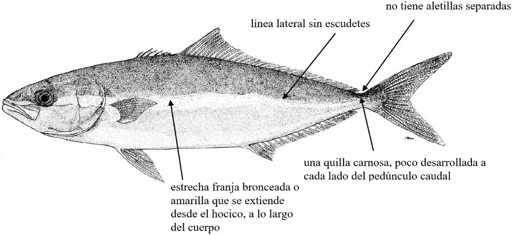 Elagatis bipinnulata tiene la aleta dorsal y anal terminadas en una aletilla separada.