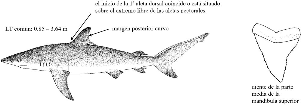 Carcharhinus falciformis tiene el origen de la primera aleta dorsal situado ligeramente por detrás de los extremos libres de las aletas pectorales. C. galapagensis presenta la segunda aleta dorsal más alta (2.1 a 3.3% de la longitud total).