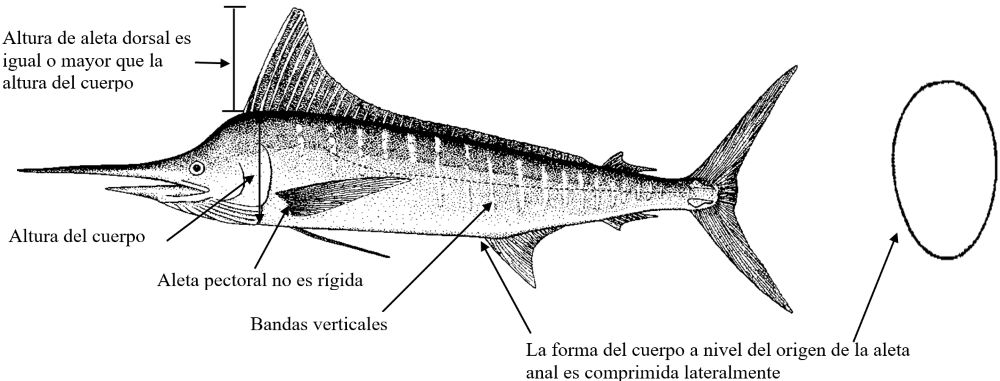 Makaira nigricans no tiene el cuerpo comprimido lateralmente a nivel del origen de la aleta anal y la primera aleta dorsal es menor que la altura del cuerpo.
