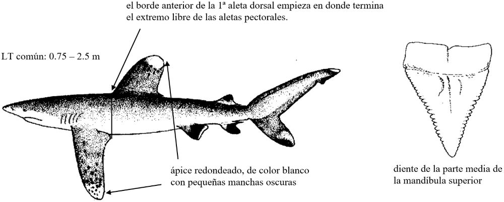 Carcharhinus leucas presenta el ápice de las aletas dorsal y pectorales no redondeado, y el borde anterior de la primera aleta dorsal empieza por delante de los extremos libres de las aletas pectorales.